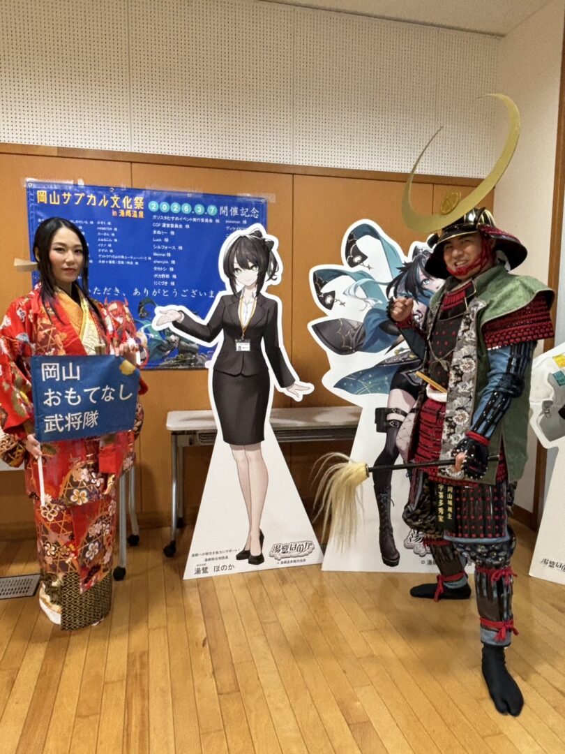湯郷温泉で開催された、「岡山サブカル文化祭in湯郷温泉2026」に宇喜多秀家、豪姫、明石が出陣しました。